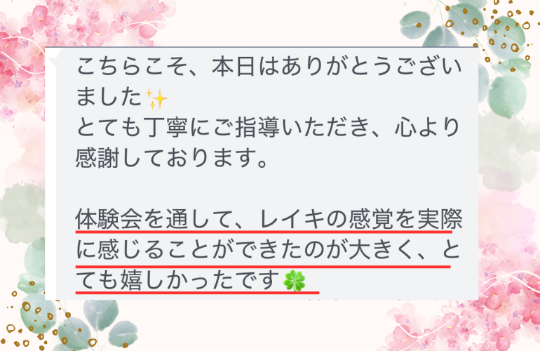 体験会では、「明確にレイキというものを感じられました」というご感想をいただきました。実際に体で感じることで、頭で理解していたことがストンと腑に落ちる瞬間があります。